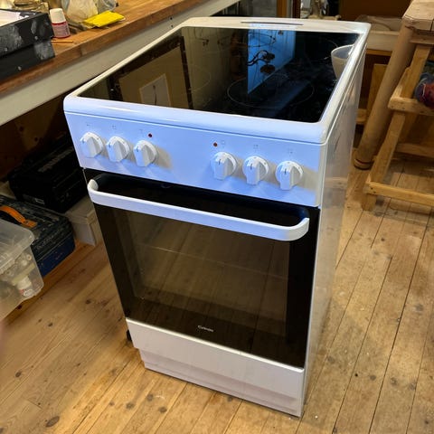 Electrolux glaskeramikspis i vit färg. Spisen har glaskeramikhäll med fyra kokzoner och ugn med flera inskjutningsnivåer för plåtar och galler. Under ugnen finns en utdragbar låda för förvaring av plåtar och köksredskap.