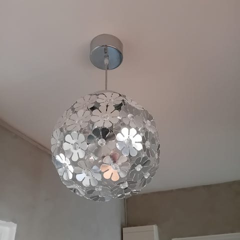 Klotformad plafond/hängande lampa i metall med cirkulära, klara dekorationsdetaljer som ger ett ljusgenomsläpp genom hela skärmen. Monteras i tak med takfäste i metall. Passar som allmänbelysning i exempelvis vardagsrum, sovrum eller hall.