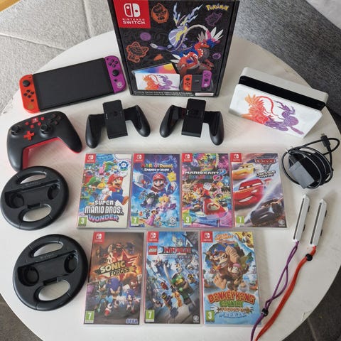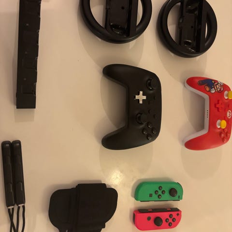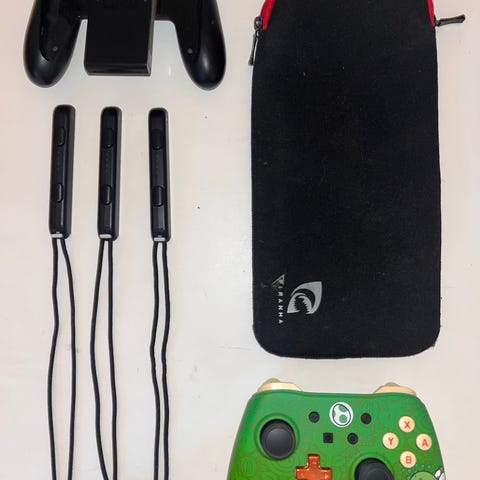 Båda kontrollerna är servade hos Bergsala (Nintendo-service) – styrspakar bytta/kalibrerade. Knappar och funktioner fungerar felfritt.
