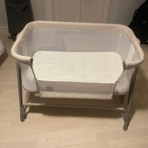 Lionelo bedside crib i grå textil. Sängen har öppningsbar sida med nätpanel för insyn och luftcirkulation. Ställning i metall med stabila ben. Förvaringsficka på sidan. Avsedd för spädbarn som sovplats intill föräldrasäng. Madrass och tygklädsel är vadderade för ökad komfort för barnet. Bälten som används för att fästa bedside crib till sängen saknas. Insektsnät ingår. Varumärke Lionelo. Hämtas i Hindås.