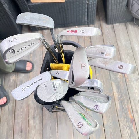 Golfset bestående av flera järnklubbor i metall med numrerade huvuden samt tillhörande golfbag. Bagen är i huvudsak blå med orange detaljer och flera ytterfickor för förvaring av tillbehör. Setet lämpar sig för spel på bana och träning på range, och ger möjlighet att täcka olika slaglängder med de olika järnklubborna. Passar golfare som vill ha ett komplett set med bag och klubbor i ett. Och i golfbagen är det bara titelest och cobra klubbor!