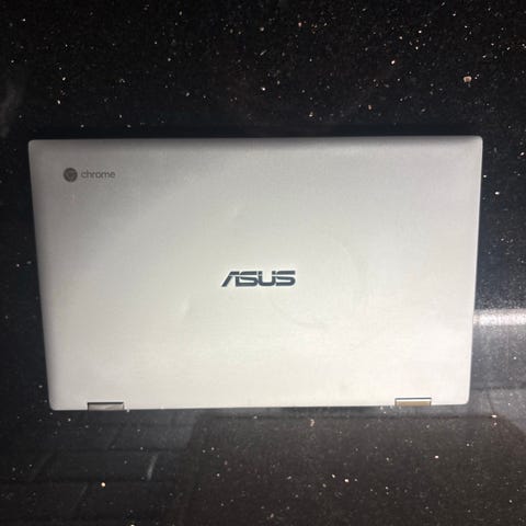 Asus Chromebook laptop i silverfärg. Datorn har ett tangentbord i fullstorlek och en stor styrplatta. Skärmen är av standardstorlek för bärbara datorer och lämpar sig för vardagligt bruk som webbsurf, kontorsarbete och studier. Operativsystemet är ChromeOS, vilket innebär att datorn är anpassad för användning med webbaserade tjänster och appar från Google.