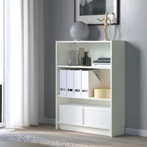 Ikea bokhylla i vit färg. Flera öppna hyllplan för förvaring av böcker, pärmar och dekoration. Nedre delen har plats för förvaringslådor eller tidskriftssamlare. Passar i vardagsrum, arbetsrum eller liknande utrymmen för öppen förvaring och organisering.