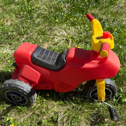 Mopeden är i svart plast med grå sits, grå detaljer och tre hjul.fordonet är avseddt för små barn som ska öva balans och motorik inomhus eller utomhus på jämnt underlag. 200 för mopeden