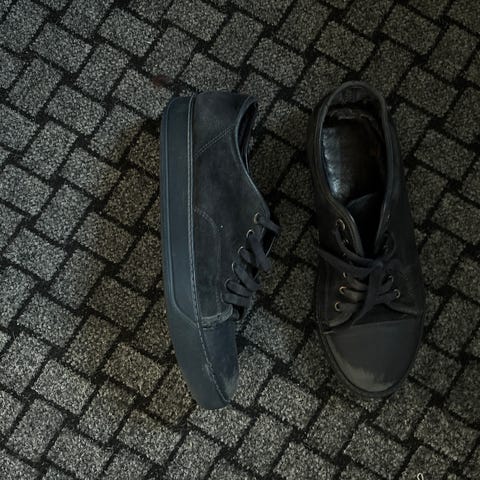 Ett par sneakers från Lanvin i beige nyans. Skorna har vita skosnören och en glansig tåhätta i en ljusare beige ton. Sulan är vit och har en diskret logotyp undertill. Skorna är i en klassisk låg modell. Storlek 43.