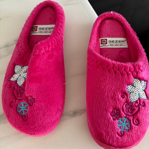 Vinterskor/tofflor i storlek 39 i rosa färg. Ovandel i ribbad textil med mjuk, teddyfodrad kant runt öppningen. Yttersula i gummi eller liknande material med mönstrad undersida för bättre grepp. Lämpliga som varma innetofflor eller lättare vinterskor.