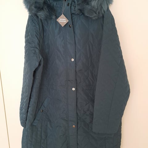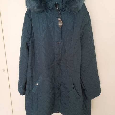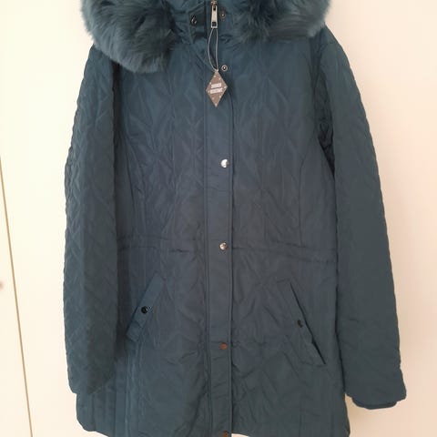 Turkos, lätt och tunn damjacka, som kan dras åt i midjan med ett skärp. Jackan har en avtagbar pälskant på huvan, fickor och dragsko på ärmen.