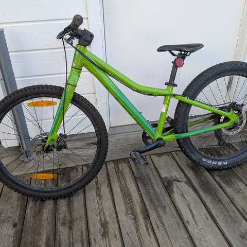 Scott barncykel med 24" hjul. Cykeln har blå ram med kontrastdetaljer och grovmönstrade däck anpassade för blandad körning på grus och asfalt. Utrustad med växlar bak, handbromsar och stöd. Passar barn som behöver en något större cykel för vardagscykling och enklare turer på olika underlag.