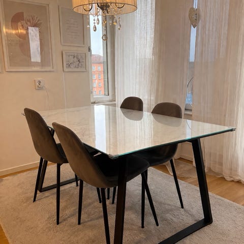 Superfin Matgrupp från Mio men 4 stolar i grå sammet & ben i svart metall, väldigt bra skick och jättesköna att sitta på. Vit bordsskiva med svarta ben i metall. Bordet har vissa små märke längs kanterna (som enkelt går att täcke genom att ha den sidan mot en vägg) och ett jättelitet märke mitt på, därav det billiga priset!