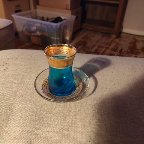 Detta är ett traditionellt turkiskt teglas med guldfärgade dekorationer och tillhörande fat och sked.