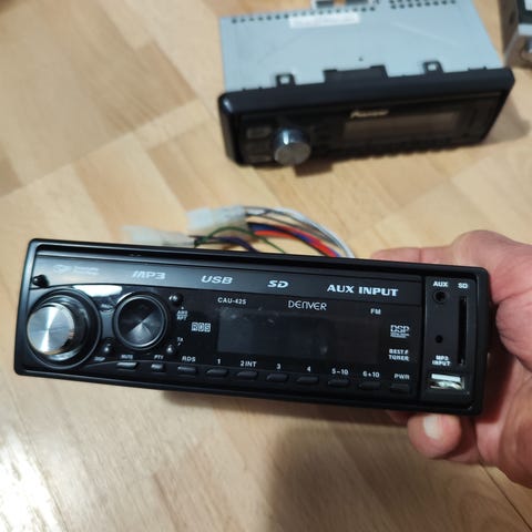 Midaint MT2300BT bilstereo i svart utförande. Enheten är av standard enkel-DIN‑storlek för montering i bil. På fronten finns display, funktionsknappar och volymratt. Baksidan har anslutningar för högtalare, ström och externa ljudkällor enligt märkningen på apparaten. Strömförsörjning: 12 V DC negativ jord. Högtalarimpedans: 4–8 ohm. Frekvensområde FM: 87,5–108 MHz, MW/AM: 522–1620 kHz. Medföljande kablar för anslutning till bilens elsystem och högtalare syns på bilderna. Passar som ersättningsenhet i bilar som använder enkel-DIN bilstereo.