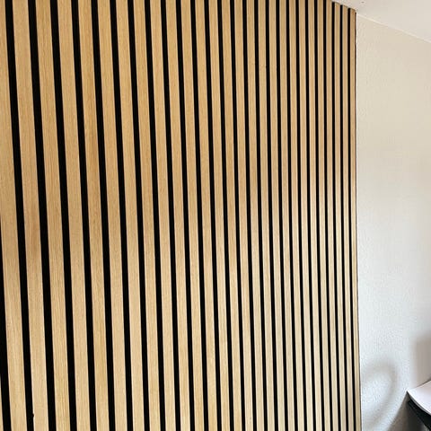 Säljer akustikpaneler i oljad ek med ljusgrå filt från Wood on Wall. Höjd 240cm. En panel är i fullstorlek