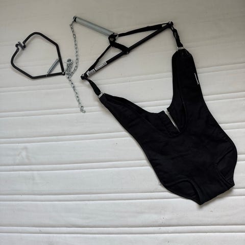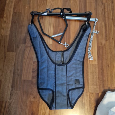 Svart tyg. Passar barn upp till 10 kg. Sätts upp I dörrkarmen, inget borrade behövs. Finns i Solna.