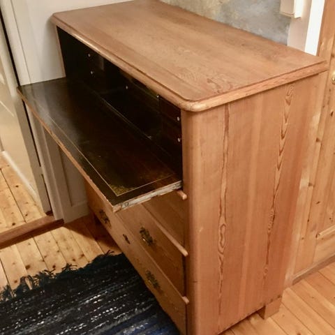 Sekretär i träfanér med nedfällbar skrivskiva. Överdelen har mindre lådor och fack för förvaring av papper och småsaker. Underdelen består av flera större lådor med runda beslag. Möbeln står på raka ben och har en ljus träton.