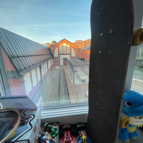 Skateboard i plast med blått deck och genomskinliga hjul med inbyggda LED-lampor som lyser vid rullning. Funkar jättebra!