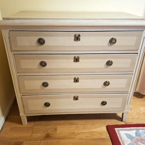 Beslag: Den är försedd med klassiska draghandtag i mässing eller guldfärgad metall, vilket är typiskt för 1800- och 1900-talsmöbler i denna stil.