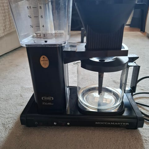 Moccamaster kaffebryggare med glaskanna. Plastlocket till kannan är trasigt på ena sidan enligt bild men funkar bra ändå.