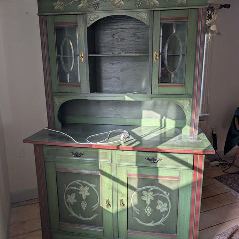 Vitrin dörrar i trä med spröjs, i ek faner. Dörrarna har rektangulära glasrutor indelade med trä spjälor och är lämpliga för inomhusbruk, suttit i ett kök.