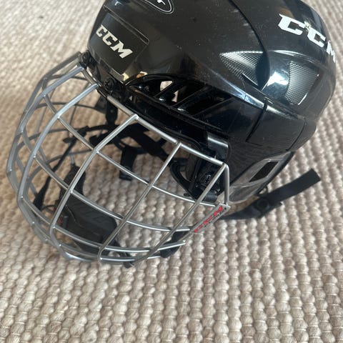 CCM hockeyhjälm med galler i svart färg. Hjälmen har justerbar passform och är utrustad med metallgaller framtill för ansiktsskydd. Ventilationsöppningar finns på ovansida och sidor för luftflöde. Certifieringsmärkning enligt HECC och ASTM F1045-07 syns på baksidan.