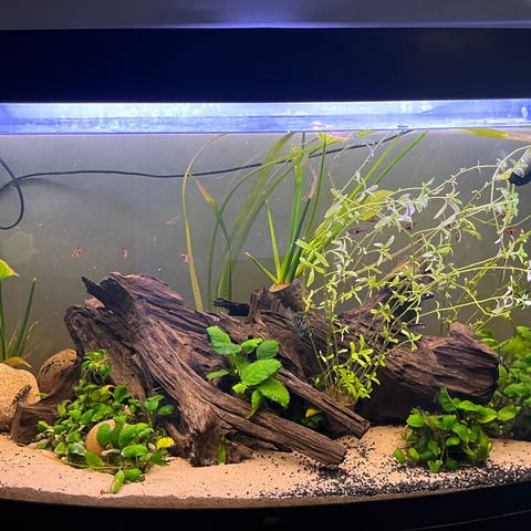 Anubias barteri akvarieväxt i grön färg. Växten är lämplig för sötvattensakvarium och kan fästas på rötter eller sten. Den har kraftiga, mörkgröna blad och trivs i svagt till måttligt ljus. Passar som inredning i akvarium för att skapa gömställen och en mer naturlig miljö för fiskar och andra vattenlevande djur.
