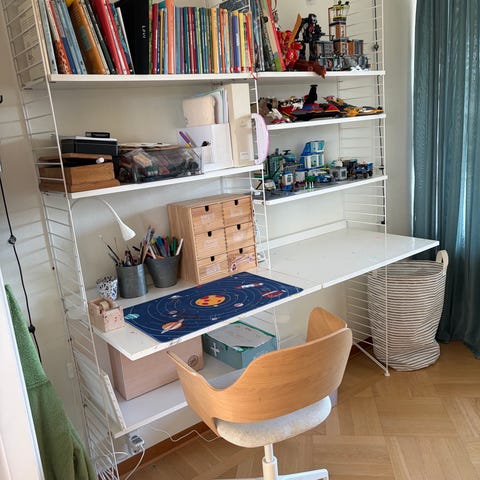String hyllsystem väggmonterat i vit kulör bestående av 5 hyllplan, 1 skrivbordsdel och 2 gavlar.. Passar för förvaring av böcker, kontorsmaterial eller dekoration i exempelvis vardagsrum, arbetsrum eller barnrum. Flexibel lösning där hyllplanen kan justeras i höjd efter behov. Vi har använt hyllsystemet i ett barnrum.
