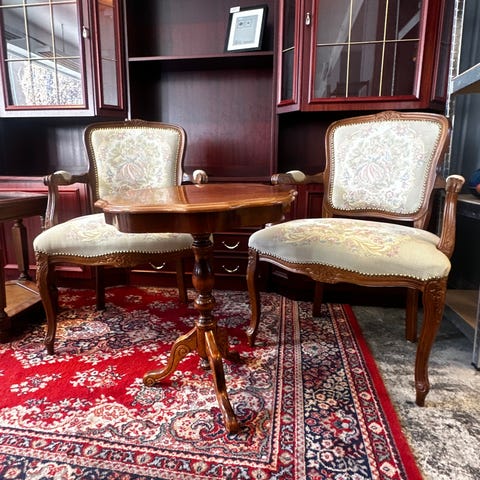 2 st antika karmstolar i nyrokoko/rokokostil, ca sekelskifte 1900. Snidad rygg och klädd sits. Stabil stomme.