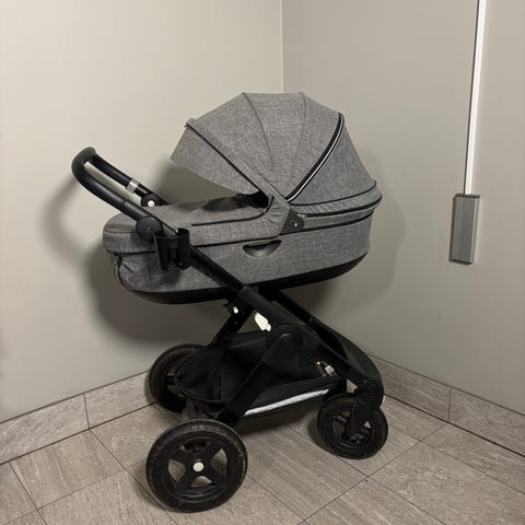 BRIO barnvagn kombivagn i grått tyg med ljus insida i liggdelen. Vagnen har separat liggdel och sittdel som kan användas på samma chassi. Chassit har fyra hjul, svängbara framhjul och justerbart handtag. Rymlig varukorg finns under vagnen. Sittdelen har sufflett och sele, liggdelen har avtagbart överdrag och madrass. Passar för spädbarn i liggdel och större barn i sittdel. Använd av ett barn.