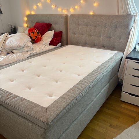 Mio Sammets Beige Komplett kontinentalsäng 120x200 cm i princip nyskick med tillhörande knappad gavel.