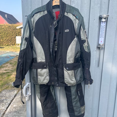 Richa jacka i goretex (m ryggskydd i) samt Lindstrands Mc byxor. Passande barn från cirka 11-14 år. Men testa på plats är det bästa.
