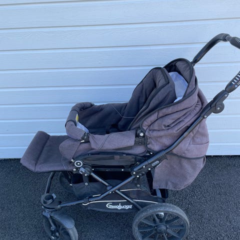 Stabil och bra kronan vagn med både ligg- och sittdel. Däcken behöver pumpas och fixas till men annars funkar den bra.