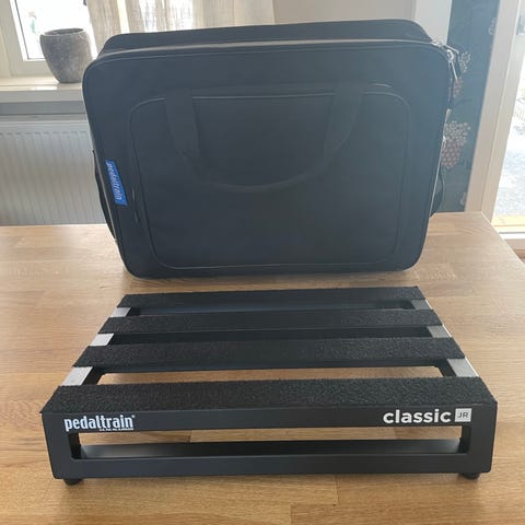 Pedaltrain pedalboardväska i svart tyg för det mindre pedalbordet. Väskan har bärhandtag upptill och dragkedja runt om. Invändigt finns ett större huvudfack anpassat för pedalboard eller liknande gitarrutrustning. På framsidan finns ett extra ytterfack med dragkedja för kablar, nätaggregat eller andra mindre tillbehör. Materialet är textil med vadderade sidor för grundläggande skydd vid transport och förvaring av gitarrpedaler och tillbehör.