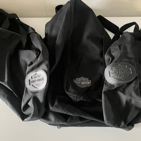 Harley-Davidson motorcykelväskor i svart textil. Setet består av två väskor i olika storlek med bärhandtag och dragkedjor. Väskorna har flera fack och sidofickor samt metallringar för fastsättning på motorcykel. På framsidan finns Harley-Davidson-emblem. Till väskorna hör två svarta överdrag med reflexdetaljer. Lämpliga som packväskor för montering på motorcykel vid pendling eller längre turer.