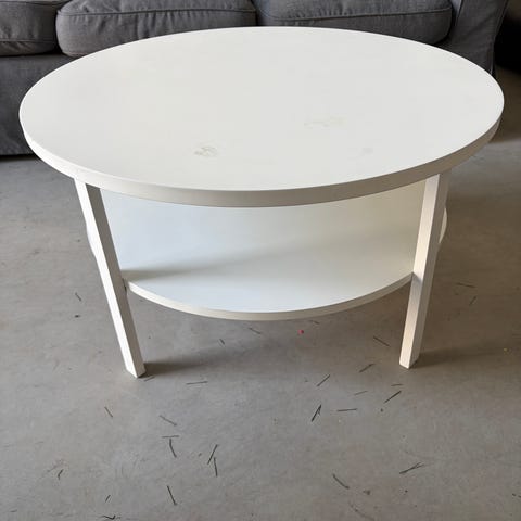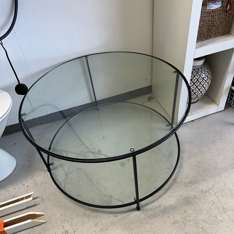 Säljer ett stilrent runt soffbord med glasskiva och vit metallstomme. Bordet har även en praktisk hylla undertill för förvaring av tidningar, fjärrkontroller eller dekoration.