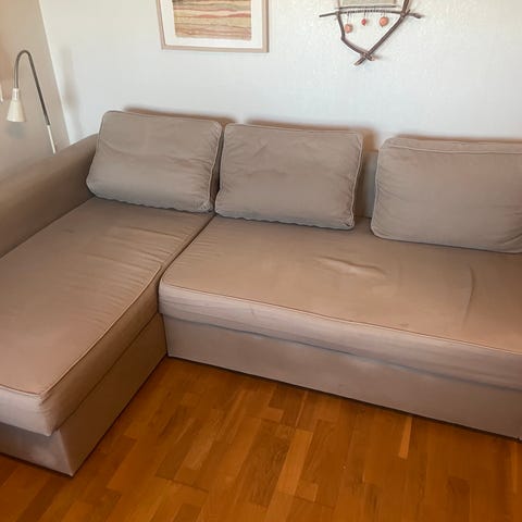 Soffan köptes 2021 och är i bra skick. Den har en ljus, neutral klädsel som passar i de flesta hem.