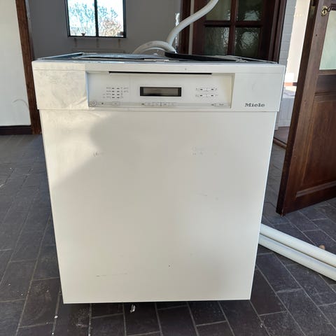 Miele Professional PG 8059 AW diskmaskin i vit färg. Professionell modell avsedd för intensiv användning, med frontpanel i rostfritt stål och digital display med knappar för programval och inställningar.