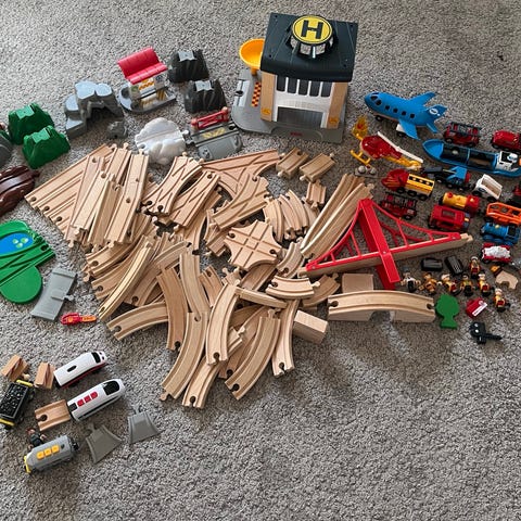 En reäl påse med trätågbana med diverse olika delar.