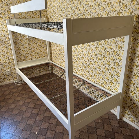 IKEA våningssäng i trä med två liggplatser. Är delnings bar så det blir en vanlig dubbelsäng eller 2 st vanliga Sängar. är tillverkad i trä med synlig trästruktur. På bilderna syns två madrasser placerade på respektive bädd. Konstruktionen består av en nedre och en övre säng med. Passar som sovplats i till exempel barnrum, gästrum eller fritidsboende. Madrassernas brädd 80cm längd 194cm.
