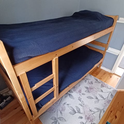 Detta är den ultimata sängen för en sommarstuga. Både madrasser o bädd madrasser ingår.