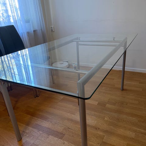 Bordet har en tjock glasskiva och stabila kryssformade metallben, vilket ger en modern och exklusiv känsla.