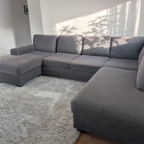 Soffa med schäslong samt puff som kan användas som förlängning. Schäslongen kan sättas bägge sidor. Grå färg med struktur. Inköpt 10 år sedan och har används som husets 2a soffa. Djur- och rökfritt hem.