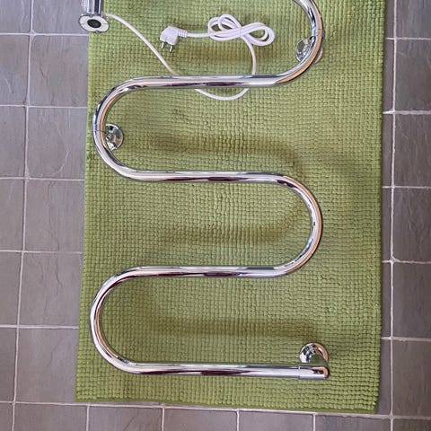 Handdukstork i kromad metall. Stegmodell med horisontella rör och två vertikala sidoprofiler. Passar för montering i badrum eller tvättutrymme för torkning och uppvärmning av handdukar och textilier. Mått H: 800 mm