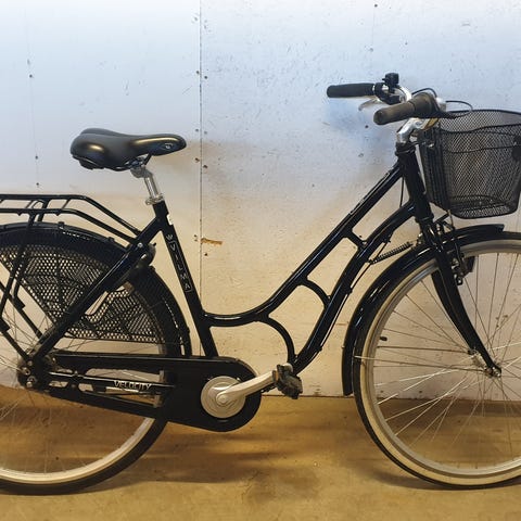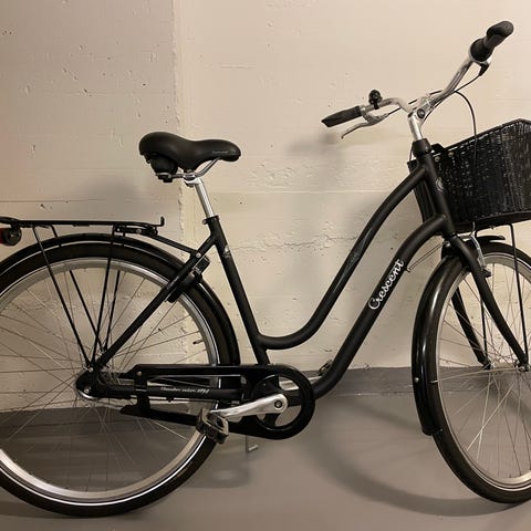 Sjösala Kornelia damcykel med 51 cm ram och 28" hjul. Cykeln har lågt insteg anpassat för kvinna. Utrustad med fotbroms bak, navväxel, kedjeskydd, skärmar och pakethållare bak. Framtill finns en cykelkorg för transport av mindre saker. Färgsättning i turkos ram med lila detaljer och vita däckkanter. Lämplig för vardagscykling i stadsmiljö och kortare pendlingsturer. Cyckeln är i nyskick. Lås finns.