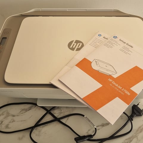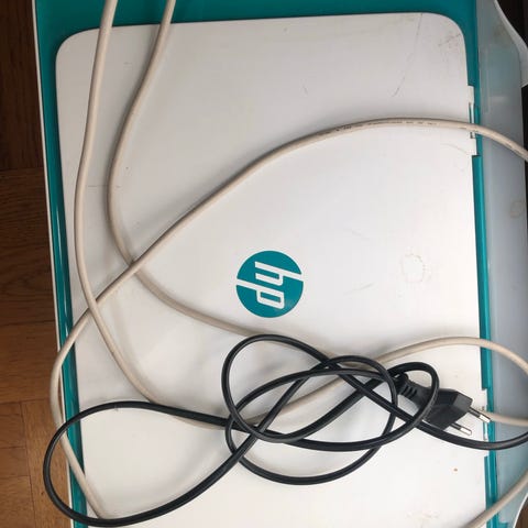 HP skrivare i vit/turkos färg. Enheten är avsedd för utskrift och kan användas tillsammans med dator för att skriva ut dokument och bilder. Strömkabel och anslutningskabel syns på bilderna. Exakta modellbeteckningar och övriga tekniska specifikationer framgår inte av underlaget.
