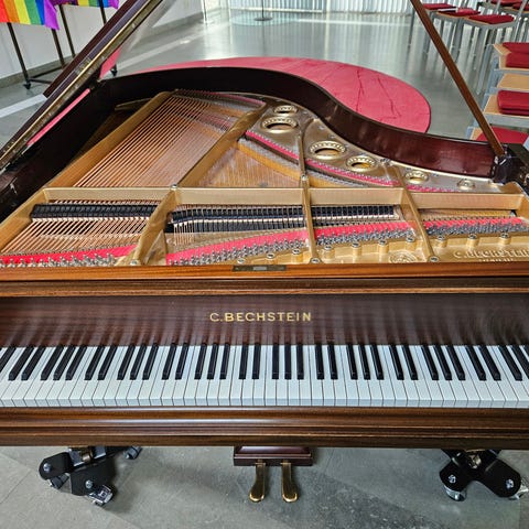 C. Bechstein flygel i brun högglansfinish. Serienummer 143182. Passar för hemmabruk, undervisning eller mindre konsert- och övningslokaler. Pianopall ingår.