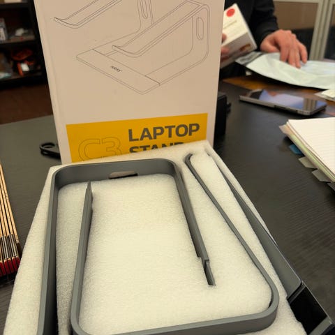 Metal Foldable Laptop Stand bärbar datorställ i metall. Hopfällbar konstruktion med justerbar vinkel för bärbar dator. Stället är utformat för att höja och vinkla datorn för mer ergonomisk användning vid skrivbord eller annan plan yta. Passar de flesta bärbara datorer inom de mått som anges på förpackningen. Kan fällas ihop för enkel förvaring och transport.
