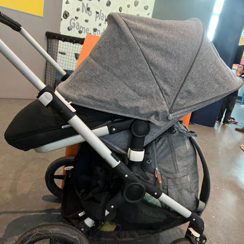 Bugaboo barnvagn i grått tyg med svart chassi. Vagnen har svängbara framhjul och större bakhjul, samt justerbart handtag. Sittdelen är vändbar och har sufflett i matchande färg. Under vagnen finns en varukorg för förvaring. Tillbehör som liggdelstyg, madrass och olika väskor/förvaringsdelar i grått tyg ingår enligt bilder.