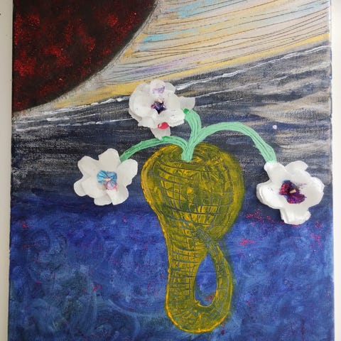 Tavla abstrakt målning självporträtt i grönt och lila
