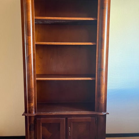 Hylla i trä med flera fack och två skåp nedtill. Perfekt för förvaring av böcker, dekorationer eller andra föremål. Passar i vardagsrum, sovrum eller kontor. Ursprungligt pris 3399kr.