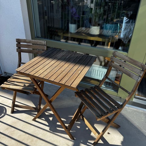 IKEA Tärnö balkongset med ett bord och två stolar. Setet har svart metallstomme och ljusbrunlaserade träspjälor i sits och bordsskiva. Möblerna är hopfällbara för enklare förvaring och passar för användning på balkong, altan eller mindre uteplats.