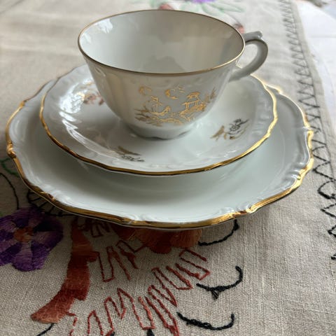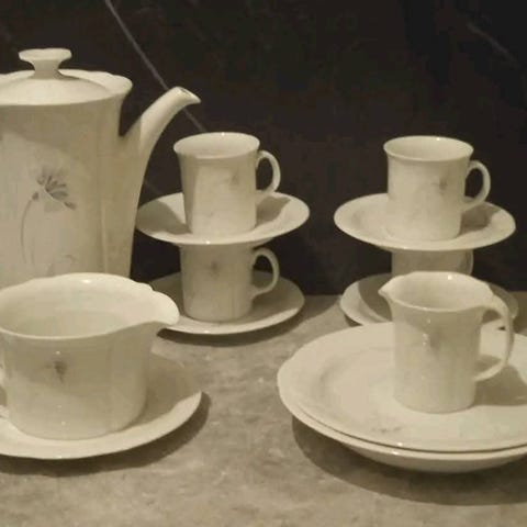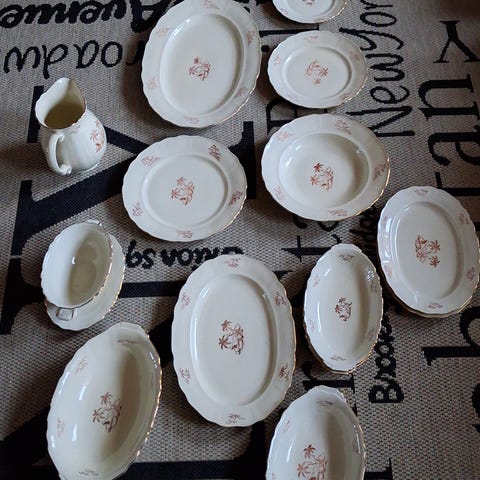 Matservis från 40-50 talet är karlskronaporslin, inga skador eller kantstötta. Stora uppläggningsfatet är gustavbergs. Kaffeservis finns flera olika. Allt är välvårdat och i fint skick. Hör av dig om något är av intresse för pris och mer information